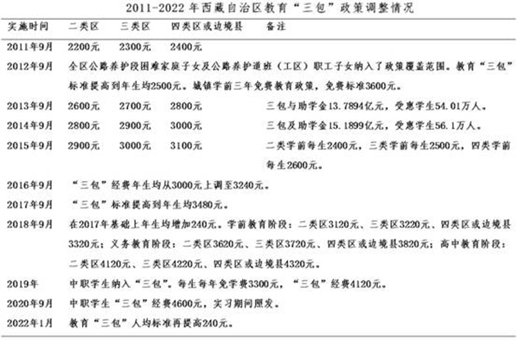 黨的十八大以來,“三包(包吃、包住、包學(xué)費)”人均標準不斷大幅提升。2012年起,西藏全面落實15年公費教育“三包”政策。同年底,西藏“三包”年總經(jīng)費由2008年的3.61億元增加到12.29億元,年均增幅達36%,受惠學(xué)生增加到51萬人。 到2014年,西藏“三包”經(jīng)費增加到15.19億元,全區(qū)有52.5萬名學(xué)生受益,覆蓋面100%,實現(xiàn)了由“選擇性保障”到“覆蓋式保障”。 中央第六次西藏工作座談會后,投入力度更大。1985-2015年30年間,西藏“三包”經(jīng)費累計投入逾80億元, 而到2020年35年投入超200億元。僅2016-2020年,西藏教育“三包”資金投入達104.74億元,年均增幅11.4%。 從1985年到2020年的35年間,西藏教育“三包”政策累計調(diào)整20次,2011-2020年的10年間,就調(diào)整了10次。2022年1月,“三包”人均標準再次提高。在比如縣,2021年底全縣享受“三包”及助學(xué)金的學(xué)生達到17771人, 占比如縣總?cè)丝诘?4.5%。