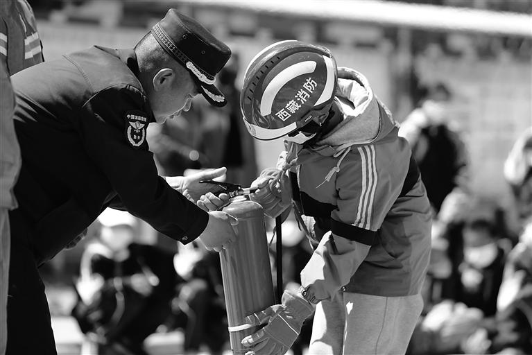 圖為消防知識進(jìn)校園活動中,消防員手把手教學(xué)生學(xué)習(xí)使用滅火器。(圖片由山南市消防救援支隊提供)