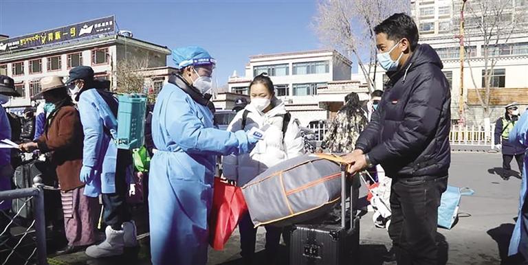 “老師好!”“同學(xué)好!”早已等候在校門口的老師一邊向?qū)W生打招呼,一邊檢查學(xué)生的核酸檢測(cè)結(jié)果證明以及線下復(fù)課同意書簽字情況。另一部分老師則仔細(xì)對(duì)學(xué)生的行李進(jìn)行消殺。拉薩市第八中學(xué)德育副校長(zhǎng)昌決表示,返校期間,入校人員必須持有48小時(shí)核酸檢測(cè)陰性證明,并落實(shí)好門口的“一測(cè)一掃兩檢查”制度,把好疫情防控第一關(guān)。
