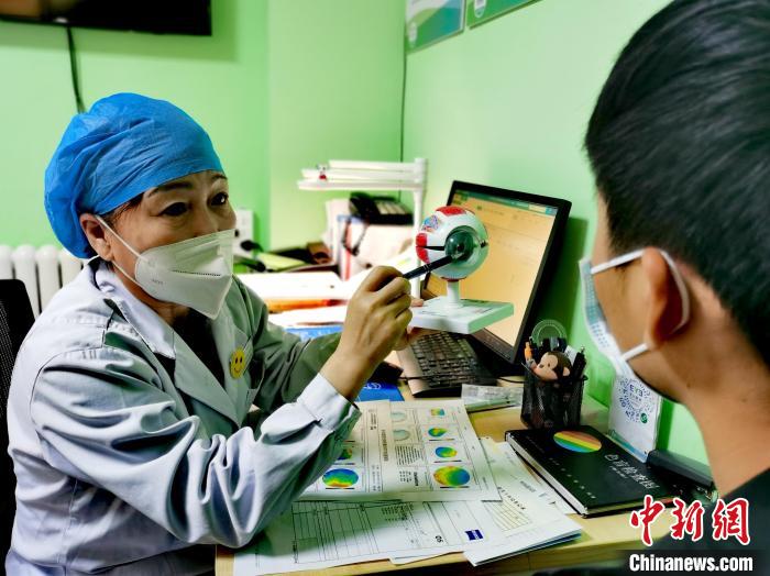 圖為青海省一醫(yī)療機(jī)構(gòu)眼科專家向患者講解近視問題?!?zhí)砀!z