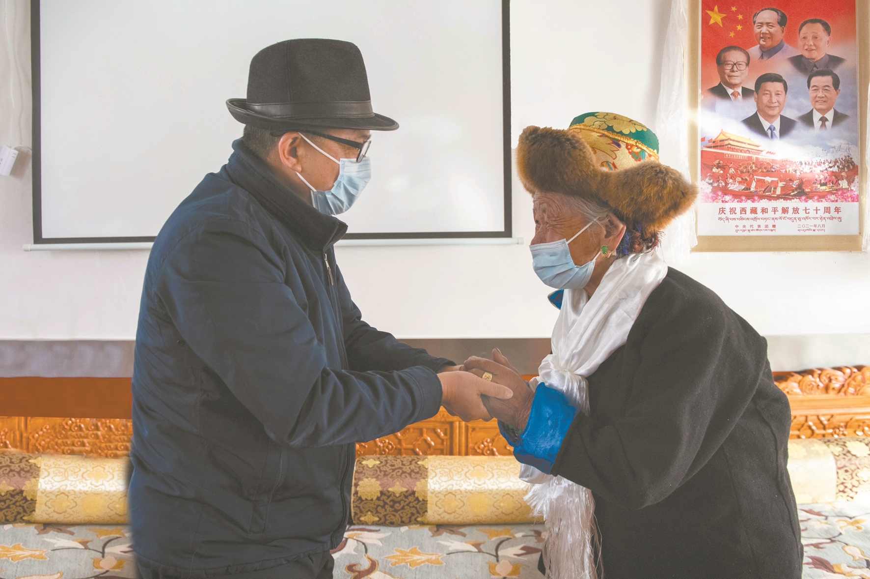 圖為市委副書記、市長王強為城關(guān)區(qū)特困人員集中供養(yǎng)中心的老人敬獻(xiàn)哈達(dá),致以節(jié)日美好祝福。拉薩融媒記者 玉珠多杰攝