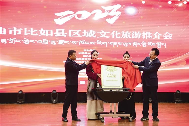 隨后,比如縣、索縣、巴青縣、嘉黎縣代表依次通過文旅資源推介向大家展現(xiàn)了不同縣區(qū)別樣的自然風(fēng)光與人文風(fēng)采。同時,現(xiàn)場還舉辦了比如唐蕃古道文化旅游景區(qū)國家AAAA級旅游景區(qū)揭牌儀式。