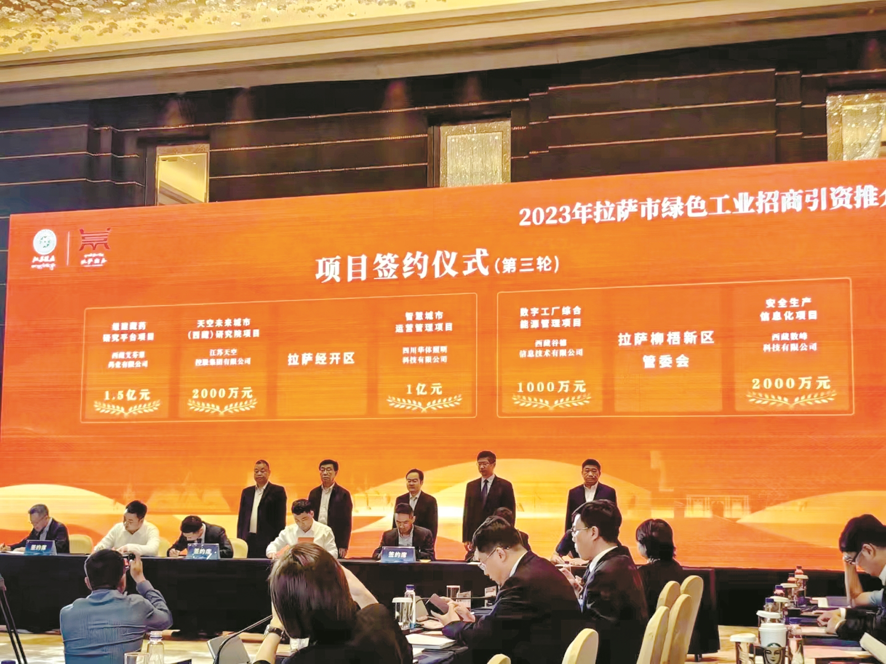 4月17日,2023年拉薩市綠色工業(yè)招商引資推介會(huì)暨項(xiàng)目簽約儀式在南京舉行,活動(dòng)由拉薩市人民政府、西藏自治區(qū)招商局、江蘇援藏前方指揮部主辦,拉薩市商務(wù)局、拉薩經(jīng)濟(jì)技術(shù)開發(fā)區(qū)聯(lián)合承辦。江蘇省商務(wù)廳副廳長(zhǎng)倪海清、江蘇省工業(yè)和信息化廳二級(jí)巡視員宋旭東、西藏自治區(qū)招商局副局長(zhǎng)次旦格來應(yīng)邀出席活動(dòng)并致辭,簽約企業(yè)代表、拉薩市各縣(區(qū))、經(jīng)濟(jì)功能園區(qū)分管招商工作負(fù)責(zé)人以及知名企業(yè)代表近140余人參加推介會(huì)。本次推介會(huì)共簽約項(xiàng)目15個(gè),協(xié)議投資達(dá)32.3億元。