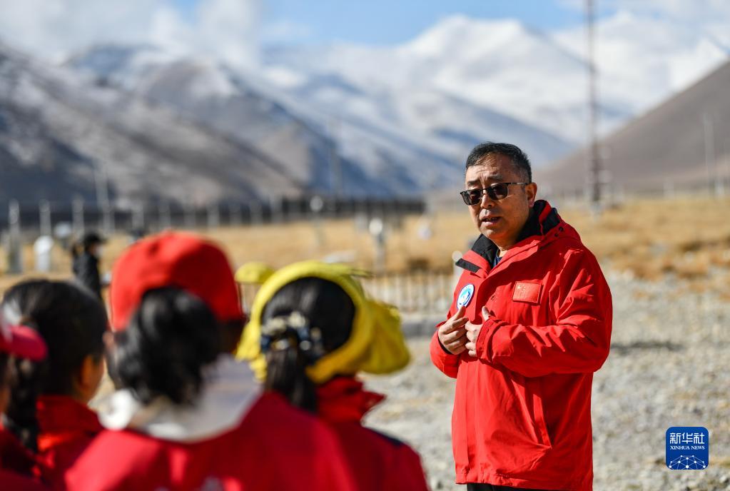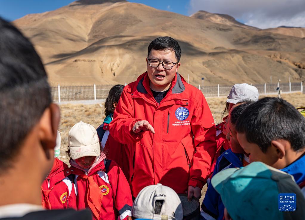 5月15日,珠峰站工作人員席振華給孩子們講解科學儀器的功能作用。新華社記者 晉美多吉 攝