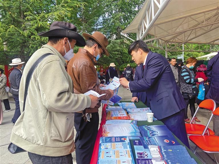 清晨的宗角祿康公園人來人往,人們或圍坐在一起等待節(jié)目開始,或流連于每個(gè)宣傳展臺(tái)前,聽工作人員講解法律知識(shí),廣場中央的電子顯示屏上正播放著《民法典》的宣傳片。