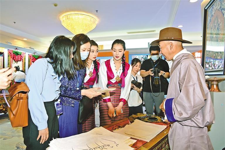 圖為在“2023·中國西藏發(fā)展論壇”上,西藏書法家向嘉賓介紹藏文書法。記者 旦增西旦 攝