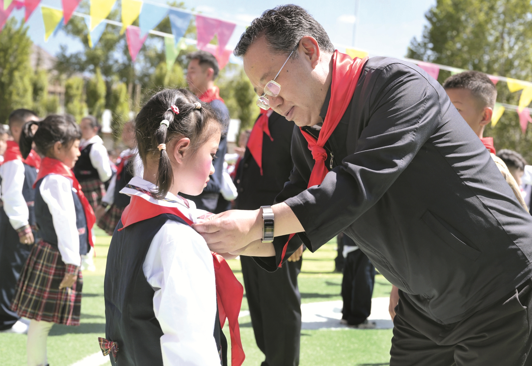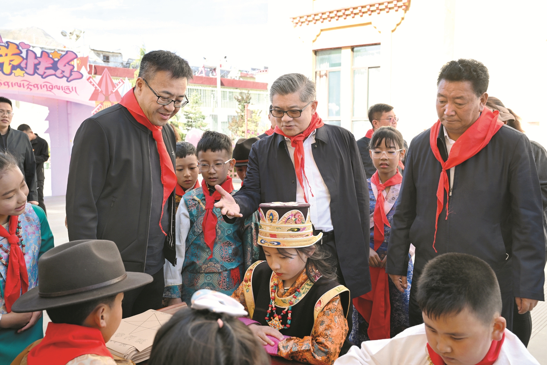拉薩市第一小學是西藏和平解放后拉薩開辦的第一所公立小學,建校70年來,為新西藏各項建設事業(yè)輸送了萬千棟梁人才。來到拉薩市第一小學江蘇路分校,身著民族服飾的藏族小姑娘南杰拉措為王強一行系上鮮艷的紅領巾,并熱情帶領王強一行走向校園。