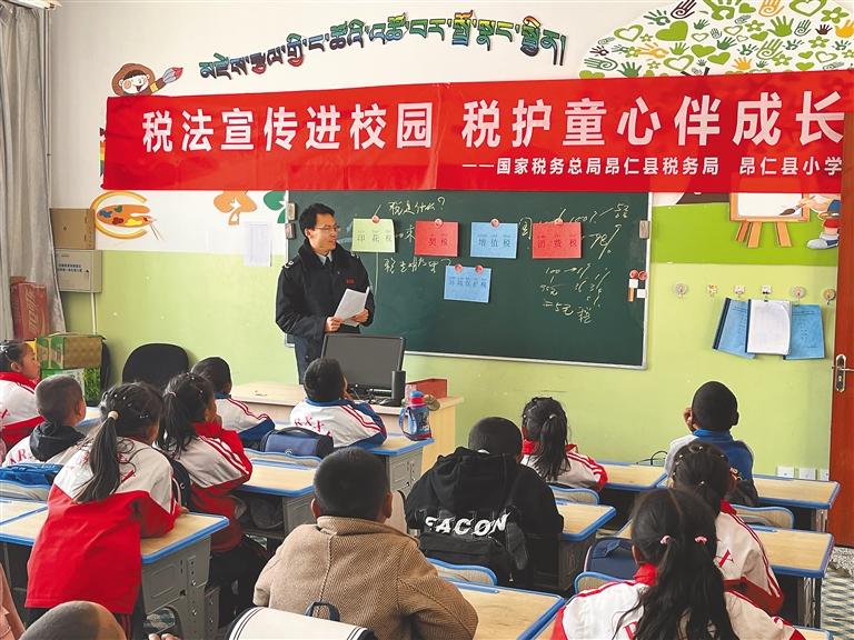 圖為國家稅務(wù)總局昂仁縣稅務(wù)局稅宣小隊(duì)的稅務(wù)干部為學(xué)生講解稅法知識(shí)。記者 楊小娟 攝