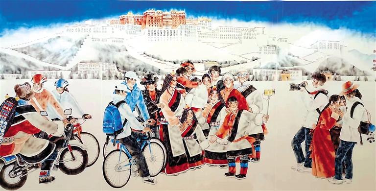 隨著一系列支持政策的持續(xù)推進(jìn)和西藏各族兒女的團(tuán)結(jié)奮斗,西藏的經(jīng)濟(jì)發(fā)展和民生水平都得到了大幅度提升。同時(shí),關(guān)注西藏發(fā)展現(xiàn)實(shí)、進(jìn)行美術(shù)創(chuàng)作的藝術(shù)家日漸增多,一件件優(yōu)秀美術(shù)作品應(yīng)運(yùn)而生,并且在全國(guó)重要展覽中精彩呈現(xiàn),向人們?nèi)?、立體地展現(xiàn)了新時(shí)代西藏人民生活的美好圖景。2022年秋季在中國(guó)美術(shù)館展出的“第13屆中國(guó)藝術(shù)節(jié):全國(guó)優(yōu)秀美術(shù)作品展覽”中,有大量表現(xiàn)西藏民族風(fēng)情和民生發(fā)展題材的美術(shù)作品,從作品構(gòu)思到藝術(shù)表現(xiàn),體現(xiàn)出鮮明的民族文化特色和民生繁榮景象,展現(xiàn)出美術(shù)創(chuàng)作者深植心底的鑄牢中華民族共同體意識(shí)創(chuàng)作理念。