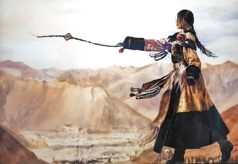 中國(guó)畫作品《幸福西藏》運(yùn)用工筆重彩的繪畫藝術(shù)表現(xiàn)形式,描繪了布達(dá)拉宮廣場(chǎng)上民族和睦的美好生活圖景。畫面中,湛藍(lán)天空下,藏族群眾與遠(yuǎn)道而來(lái)的各地游客們相聚雪域高原,燦爛的笑容映照出新時(shí)代西藏人民的美好生活,也反映出西藏自然風(fēng)光、人文風(fēng)情對(duì)各地游客的極大吸引力。從青年旅行者們或騎著單車,或舉起相機(jī)認(rèn)真拍照的表情,能深刻感受到他們對(duì)美麗西藏的向往。同時(shí),繪畫作品反映出近年來(lái)西藏旅游事業(yè)的蓬勃發(fā)展以及各族兒女團(tuán)結(jié)互助、攜手進(jìn)步的新時(shí)代美好生活景象。水彩·粉畫《颯·薩》運(yùn)用人物特寫的藝術(shù)創(chuàng)作手法,展現(xiàn)出一位西藏姑娘甩出烏爾朵的颯爽姿態(tài);油畫《藏歷新年薩迦禳祈?!芬悦骺鞜崃业纳屎嫱谐霎?dāng)?shù)孛癖娺M(jìn)行藏歷新年祈福活動(dòng)的歡樂(lè)場(chǎng)景;油畫《中國(guó)玉麥》以紀(jì)實(shí)敘事的創(chuàng)作方式,描繪了隆子縣玉麥鄉(xiāng)卓嘎、央宗姐妹放牧守邊的故事,畫面中她們專注地懸掛國(guó)旗的樸實(shí)舉動(dòng),傳遞出高原姊妹對(duì)祖國(guó)的深愛(ài)之情。