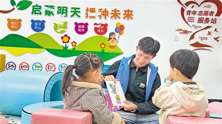 圖為昌嘎村日間照料中心的科技專干班旦次仁在陪小朋友玩耍。倫珠澤仁 記者 白瑪澤旺 攝