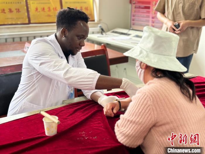 長(zhǎng)沙醫(yī)學(xué)院的留學(xué)生們?yōu)榍皝?lái)就診的村民測(cè)量血壓血糖、艾灸等,中國(guó)學(xué)生的中醫(yī)組則是通過(guò)望聞問(wèn)切的方式問(wèn)診、把脈,認(rèn)真聆聽(tīng)既往病史,解答村民問(wèn)題,出具診療意見(jiàn)。