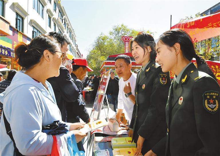 圖為9月16日上午,相關(guān)單位工作人員在拉薩宇拓路街頭為過往群眾講解國防安全知識(shí)。記者 旦增蘭澤 攝