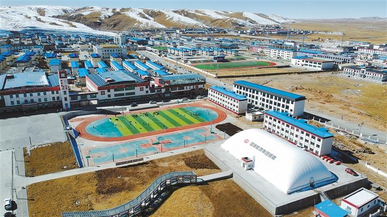 一場(chǎng)冬雪初晴,聶榮草原的空氣中彌漫著清新的氣息。嶄新的塑膠操場(chǎng)上,活躍著孩子們青春的身影。四周的教學(xué)樓、宿舍樓、多功能教室、氣膜球館等現(xiàn)代化建筑參差錯(cuò)落,儼然是這座高海拔縣城的新地標(biāo),映射著草原教育發(fā)展的鏗鏘步伐。