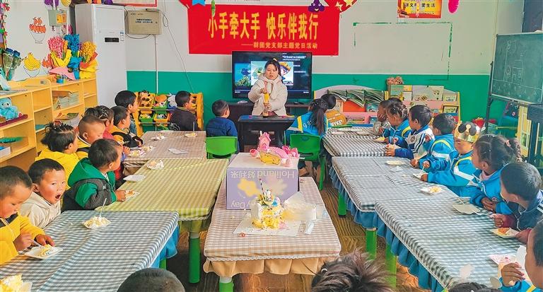 近日,山南市措美縣群團黨支部在該縣古堆鄉(xiāng)帕倉村幼兒園開展“小手牽大手,快樂伴我行”主題黨日活動,與孩子們一起講紅色故事、唱兒歌、做游戲、吃蛋糕,為孩子們健康成長加油助力。