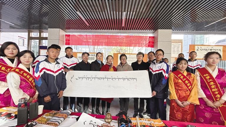 隨后,與會領(lǐng)導(dǎo)向江蘇實(shí)驗(yàn)中學(xué)贈送了150套民族團(tuán)結(jié)進(jìn)步教育讀本。大家一同觀看了書畫社同學(xué)現(xiàn)場進(jìn)行的民族團(tuán)結(jié)進(jìn)步書畫作品創(chuàng)作。中國書協(xié)會員、自治區(qū)政協(xié)委員、拉薩市政協(xié)常委、區(qū)市書協(xié)副主席南杰旺扎現(xiàn)場創(chuàng)作了“鑄牢中華民族共同體意識”的藏文書法橫幅贈送給江蘇實(shí)驗(yàn)中學(xué)。