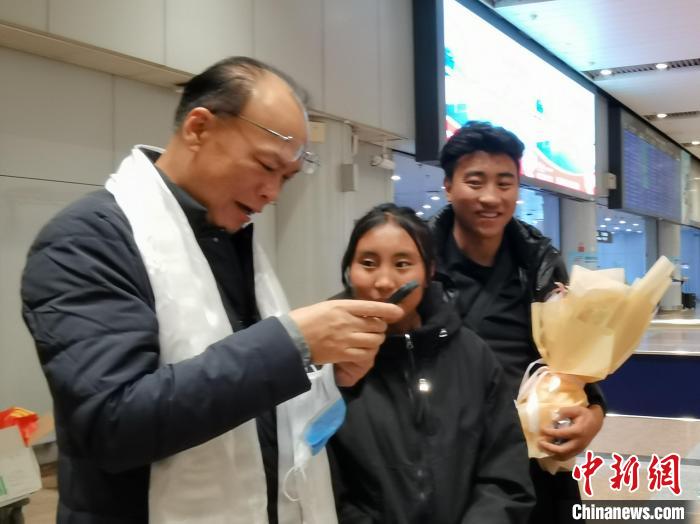 11月14日下午,來自西藏自治區(qū)昌都市的8名脊柱側(cè)彎患者到達(dá)北京首都國際機(jī)場。圖為北京大學(xué)第一醫(yī)院骨科主任李淳德(左)和藏族女孩澤巴央宗、哥哥貢布鄧珠交談。 徐雪瑩 攝