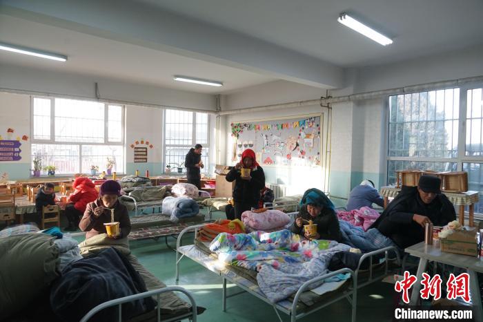 12月20日,青海省海東市民和縣中川鄉(xiāng)美一小學(xué)安置點內(nèi)民眾正在就餐。馬銘言 攝