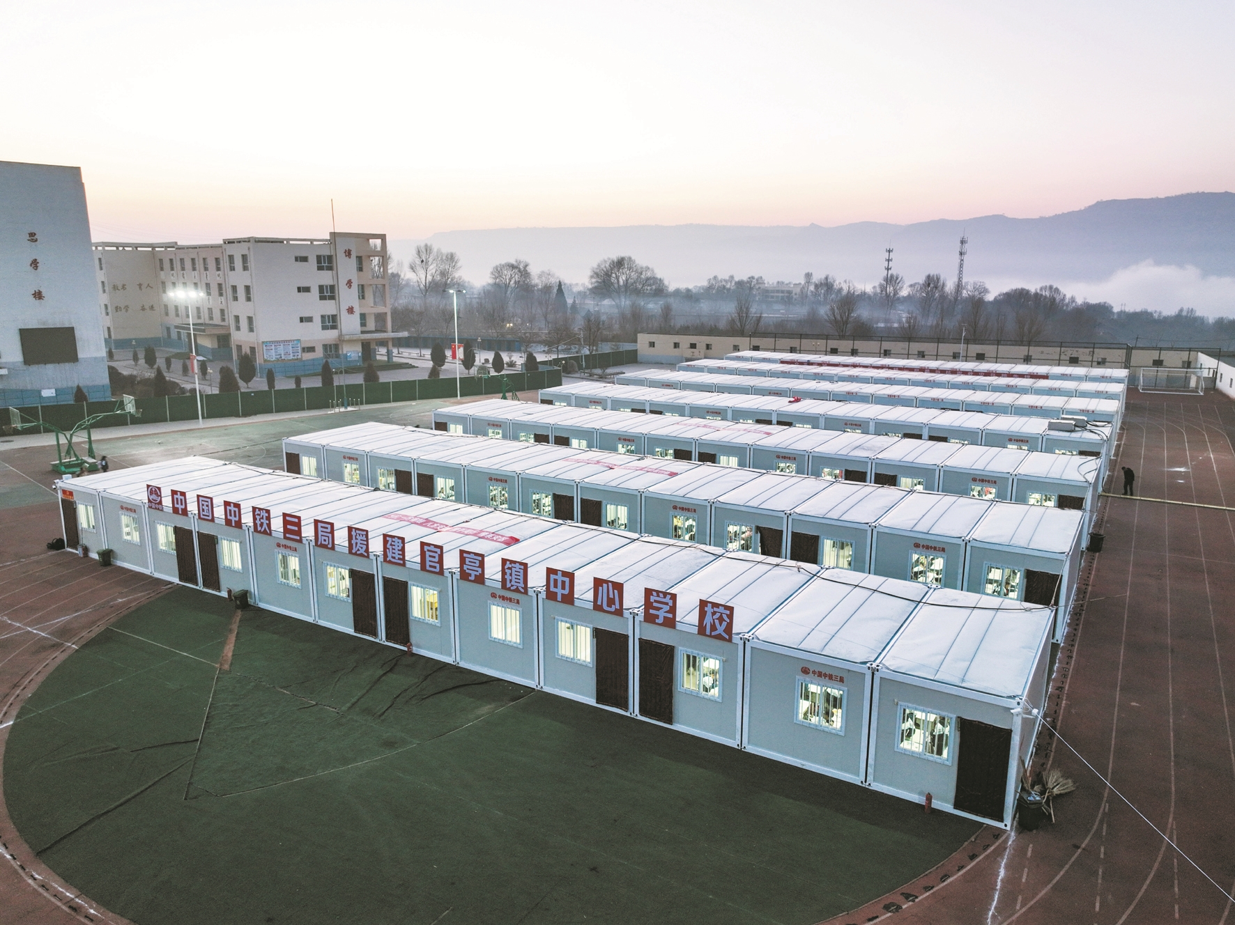 這是1月2日在青海省海東市民和回族土族自治縣官亭鎮(zhèn)中心學校拍攝的板房教室(無人機照片)。(新華社發(fā))