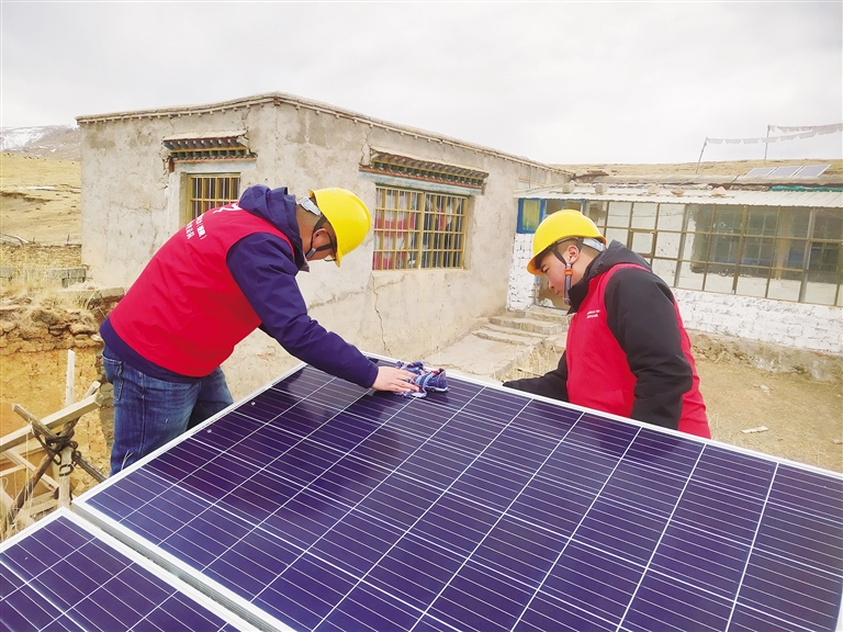 “次桑在家嗎?我們過來看一下你們新年準(zhǔn)備得怎么樣了?”聽到劉光輝的呼喚,孩子們都跑出來迎接這位“小黃帽”叔叔。劉光輝和羅桑歐珠進(jìn)屋放下年貨,顧不上休息,立馬搭梯子爬上次桑家的房頂,用抹布拂去光伏電板上的塵土,拿出工具仔細(xì)檢查電源和光伏設(shè)備是否有損壞?!按紊<矣玫氖俏覀兊牡谝淮柲芄夥姲?,這個(gè)電板要經(jīng)常擦拭,保持表面干凈,發(fā)電效率會(huì)更好。”劉光輝說。檢修完光伏電板后,劉光輝和羅桑歐珠又回到屋內(nèi)檢查次桑家的電路線路,對(duì)插排插座等可能存在安全隱患的地方進(jìn)行認(rèn)真排查。確保沒有問題后,兩人將之前昏暗的燈泡全部換成了最新的節(jié)能燈泡,整個(gè)屋子一下亮堂了起來。