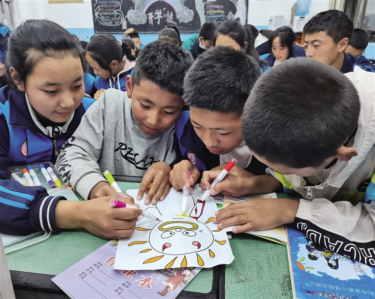 “通過(guò)拉巴卓瑪?shù)倪@幅畫,我了解到她是一個(gè)很有想法的孩子,她很清楚自己想要什么。課程剛開(kāi)始時(shí),我觀察到她一個(gè)人坐在角落里,低著頭,也不怎么和旁邊同學(xué)說(shuō)話,但是通過(guò)這個(gè)課程的開(kāi)展,她會(huì)在課后主動(dòng)跑來(lái)和我說(shuō)她近期遇到的困惑,我感覺(jué)到她正逐漸敞開(kāi)心扉,這與我們當(dāng)初開(kāi)設(shè)這個(gè)課程的初心是一樣的。我們就是希望可以通過(guò)這些課程,讓當(dāng)?shù)氐膶W(xué)生在心理方面得到更多的開(kāi)導(dǎo)、正視自己的情緒,并從中去獲得一些能量,所以現(xiàn)在看到她的變化,我很高興?!蓖蹑兼谜f(shuō)。