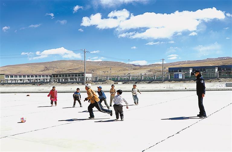 在結束執(zhí)勤,返回宿舍途中,里孜出入境邊防檢查站民警楊會強、盧帆忽聞一陣嬉笑。循聲看去,口岸邊貿市場停車場內,一群充滿活力的小朋友,正圍著一個破舊足球追趕。