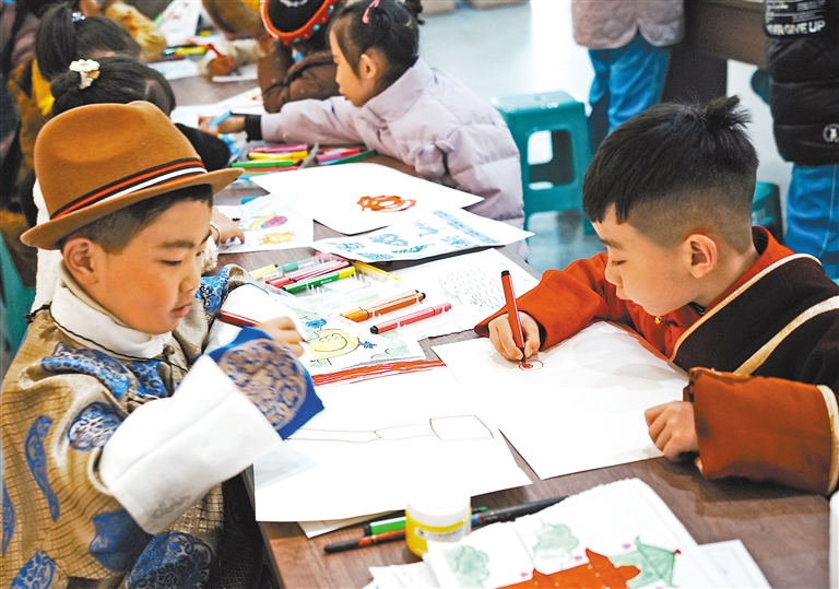 圖為孩子們在展館內(nèi)繪畫。記者 袁海霞 鄭璐 通訊員 普珍 攝