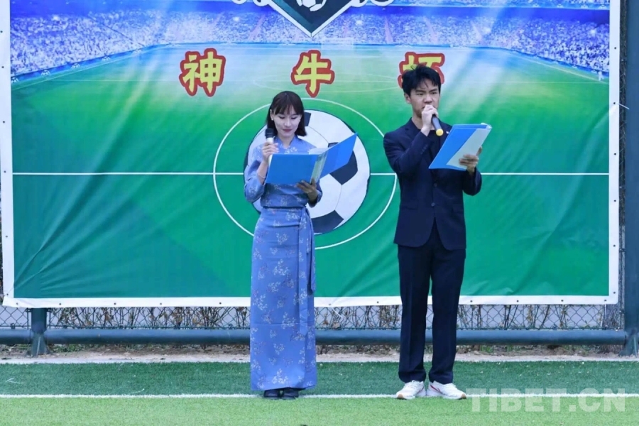 圖為正在主持神牛杯足球比賽的洛松貢布(右一)受訪者提供