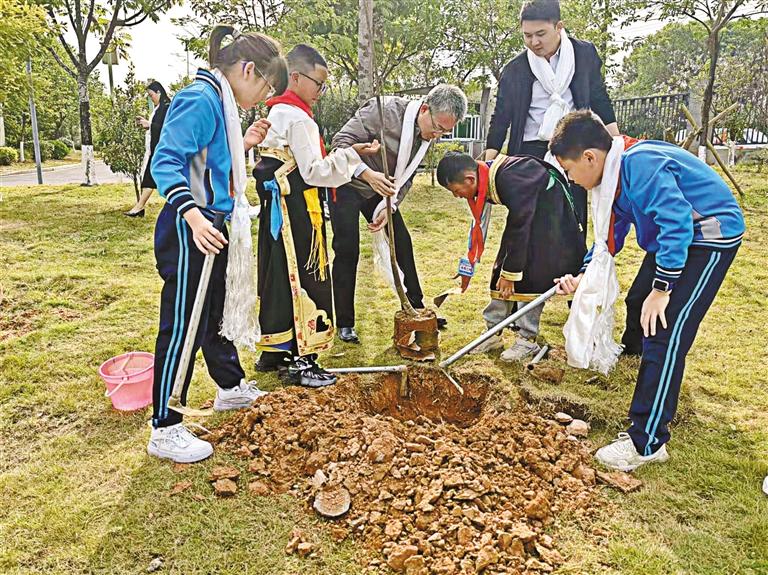 圖為“莞宜情·山海行”莞宜各族青年互訪交流活動中,東莞、巴宜兩地青少年共同種下團結之樹。