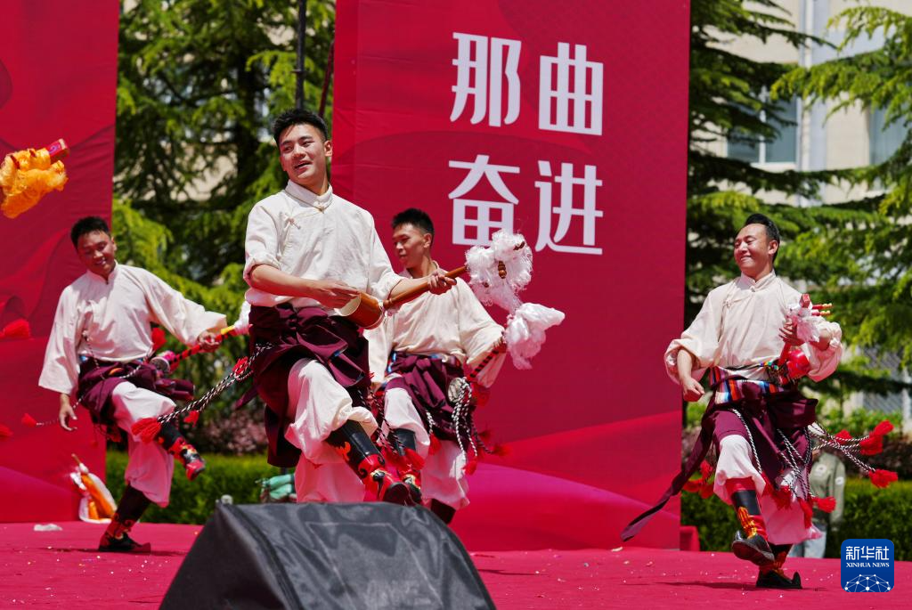 5月12日,在西藏職業(yè)技術(shù)學(xué)院職業(yè)教育活動周啟動儀式暨比如縣非物質(zhì)文化遺產(chǎn)進校園活動上,比如縣民族藝術(shù)團的演職人員在表演節(jié)目。新華社記者 張汝鋒 攝