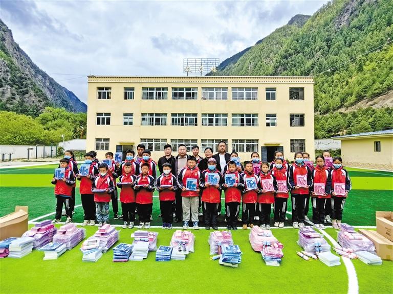 圖為林芝市紅十字會(huì)工作人員為八蓋鄉(xiāng)幼兒園捐贈(zèng)學(xué)習(xí)用品。記者 胡文 攝