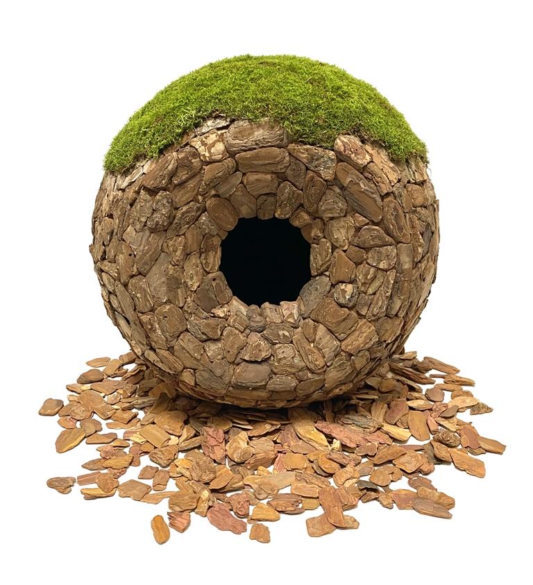 嘎瑪次仁的作品聚焦生態(tài)環(huán)境,作品《意象·自然》,是對“自然”理解的一種概念性的抽象表達。其形式上為一個中空球形裝置,表面為拼貼的樹皮,頂部種植有苔蘚。正面的部分區(qū)域內(nèi)陷,中間為一孔洞,為了更凸顯出洞中的“黑暗”與“未知”,內(nèi)部涂有特殊啞光涂料。為了體現(xiàn)出“生命感”,他在作品內(nèi)部安裝了感應(yīng)發(fā)聲裝置,感知到人靠近后會發(fā)出輕微的心跳聲。