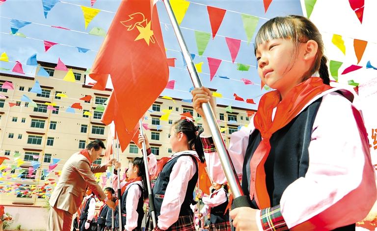 圖為一年級(jí)各中隊(duì)獲授隊(duì)旗。記者 格桑倫珠 攝