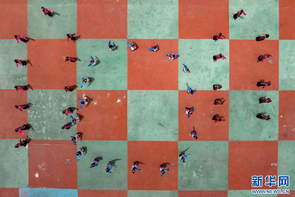 6月21日,乃東區(qū)亞堆鄉(xiāng)小學的學生在表演節(jié)目(無人機照片)。新華網(wǎng) 旦增努布 攝