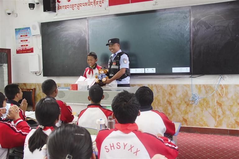 民警利用課間休息時(shí)間向次仁扎西頒發(fā)印有“拾金不昧、品德高尚”的榮譽(yù)證書并送上“警察小熊”。圖由桑珠孜公安提供