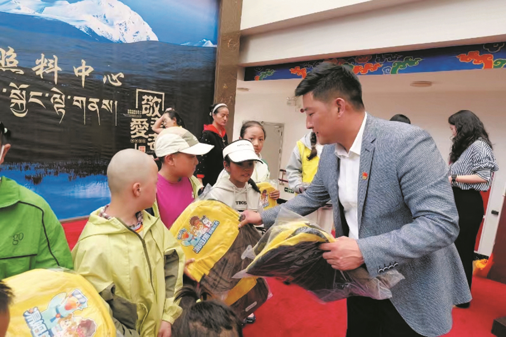 圖為自治區(qū)互聯(lián)網(wǎng)協(xié)會相關(guān)負責(zé)人為困難兒童發(fā)放學(xué)習(xí)用品。 拉薩融媒記者 齊永昌攝