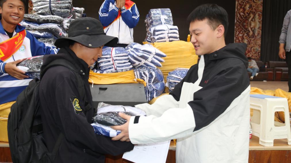 9月6日,中央民族大學(xué)第26屆研究生支教團(tuán)成員侯宇航(右)為拉薩那曲第二高級中學(xué)報(bào)到新生發(fā)放生活用品。(嘎瑪曲宗 攝)