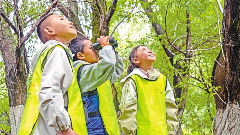 孩子們?cè)诶敐竦赜猛h(yuǎn)鏡觀察鳥類。記者 鹿麗娟 攝