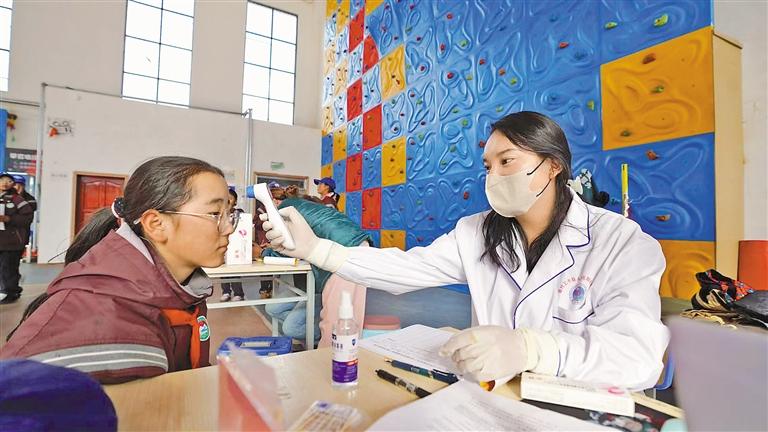 接種疫苗后,醫(yī)生在留觀區(qū)為學(xué)生測(cè)量體溫。記者 格桑倫珠 攝
