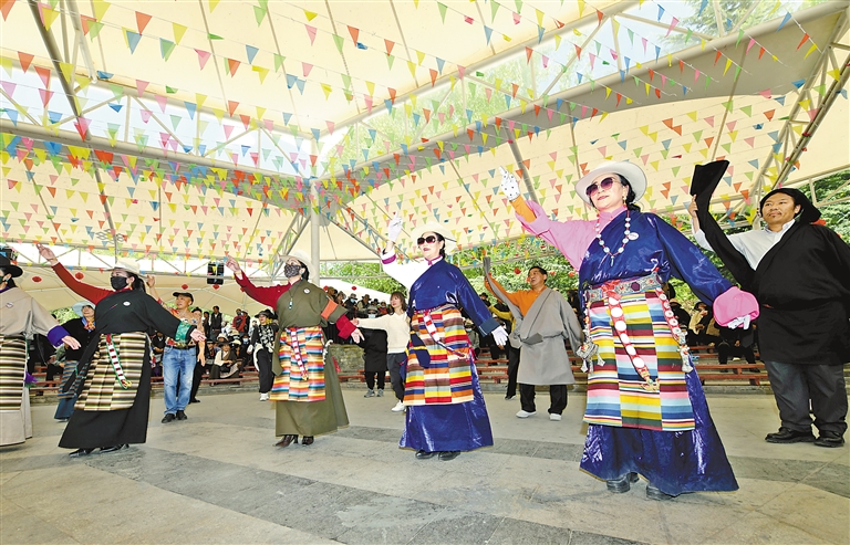 市民在宗角祿康公園跳鍋莊舞。 記者 唐斌 攝