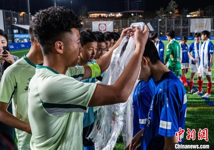 2月18日晚,“跨越山海 以球會友”藏港青少年足球交流活動在香港西沙GO PARK舉行。圖為西藏自治區(qū)雪域雛鷹隊隊員(淺綠衣)在賽前為香港東方體育會足球隊U16隊隊員戴上哈達?!≈行律缬浾?侯宇 攝