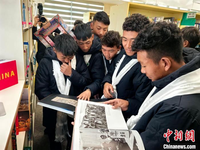 2月20日,參加“跨越山海 以球會友”藏港青少年足球交流活動的西藏自治區(qū)青少年在香港中華基金會中學圖書館翻閱介紹西藏的圖冊?!≈行律缬浾?劉大煒 攝