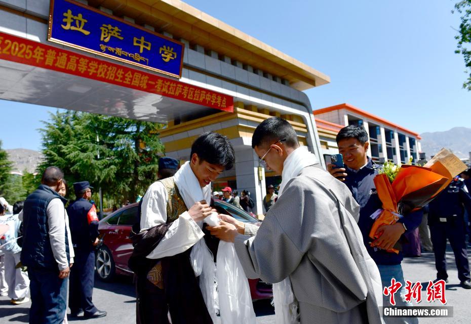 6月9日上午11時(shí)30分,西藏自治區(qū)2025年普通高考完成所有科目考試。圖為結(jié)束考試的考生們在拉薩市拉薩中學(xué)考點(diǎn)外互獻(xiàn)哈達(dá)。
