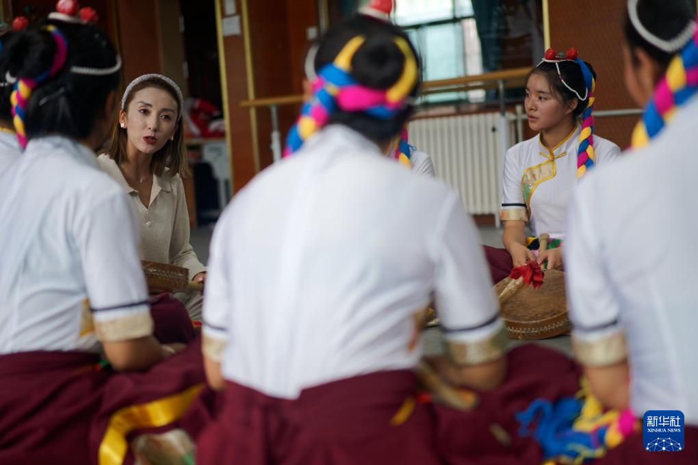 9月9日,在拉薩市第二中等職業(yè)技術學校,尼瑪卓瑪老師(右二)指導孩子們舞蹈動作。新華社記者 丁增尼達 攝