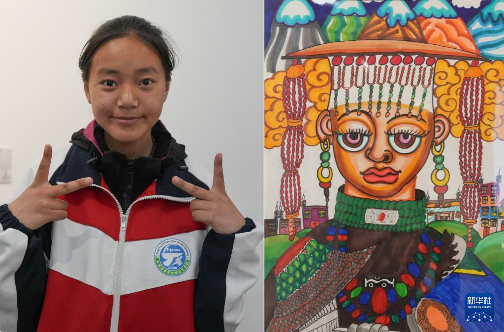 4月19日拍攝的拉薩市特殊教育學(xué)校14歲的聽(tīng)障學(xué)生貢覺(jué)央吉和她的作品《阿里服飾》(拼版照片)。新華社記者 晉美多吉 攝