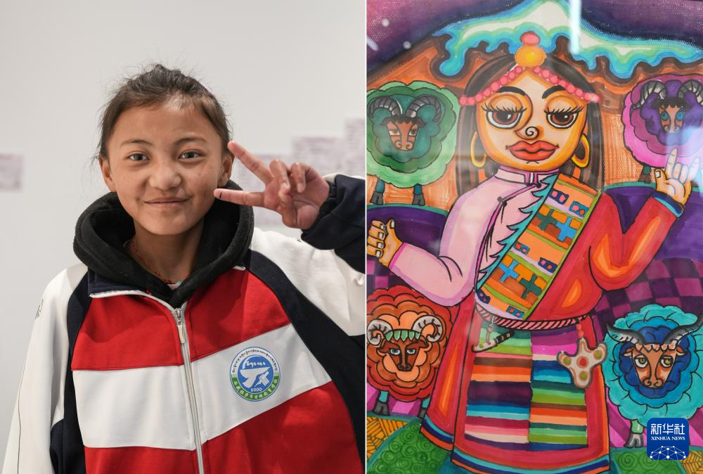 4月19日拍攝的拉薩市特殊教育學(xué)校13歲的聽(tīng)障學(xué)生白瑪次仁和她的作品《放羊的小卓瑪》(拼版照片)。新華社記者 晉美多吉 攝