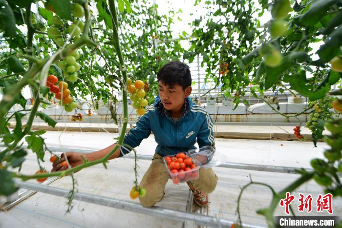 圖為2019年9月,拉薩一高效溫室大棚內(nèi),當(dāng)?shù)啬贻p的農(nóng)牧民采摘小番茄準(zhǔn)備上市銷(xiāo)售。(資料圖) 江飛波 攝