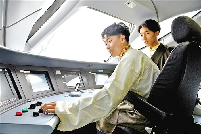 來自山西大學(xué)附屬中學(xué)西藏班的學(xué)生們在返鄉(xiāng)前,走進(jìn)太原動車所探秘高鐵。圖為學(xué)生在動車機(jī)械師的引導(dǎo)下,體驗(yàn)高鐵技術(shù)。張晉彤 記者 丹增平措 攝