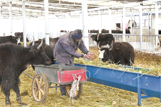 為當(dāng)雄縣凈土牧場郭慶廠員工正在給牦牛喂飼料。