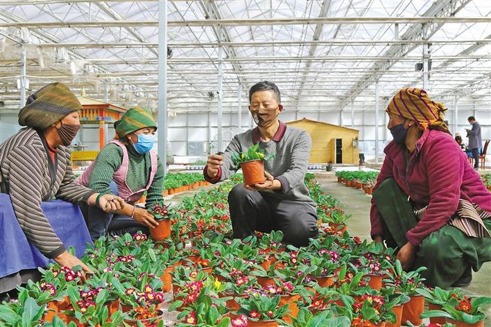 圖為在林周縣陽(yáng)光溫室示范園區(qū),技術(shù)人員在指導(dǎo)村民種植花卉?!∮浾摺⊙虢稹z